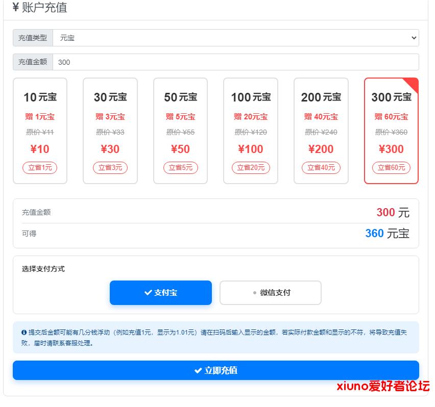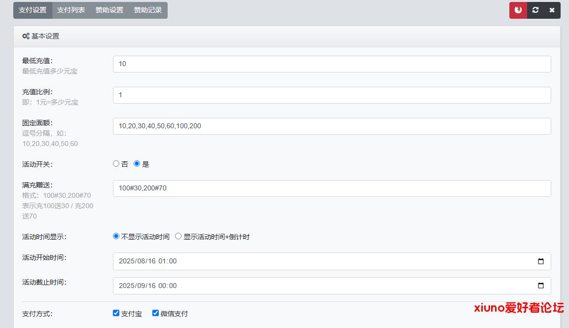 虎皮椒充值插件,支持微信,支付宝充值,支持固定面额按钮+其它、自定义活动满充赠送与时间、倒计时展示。