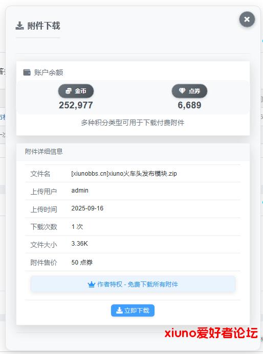 对附件下载进行美化,增加弹出层,可以显示附件详细信息。集成金币付费功能,支持附件付费下载。